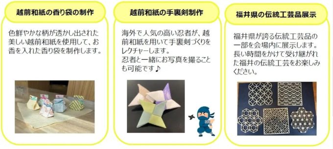 今回は、福井県と福井県観光連盟との共同企画により、福井県の伝統文化である越前和紙を使った香り袋の制作体験等ができるワークショップや福井の観光情報の発信を実施いたします。詳細は以下をご覧ください。