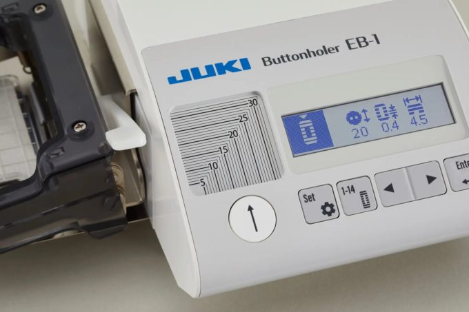 「EB-1ボタンホーラー」は、JUKIの職業用ミシンにセットすることで、14種類の高品質なボタンホールを縫うことができます。コンピュータ制御のため、ボタンホールの種類、ボタンサイズ、縫い目の幅やメス幅、縫い目のピッチの調整など細かい設定ができ、設定後はスタートボタンを押すだけでボタンホールを縫い上げます。