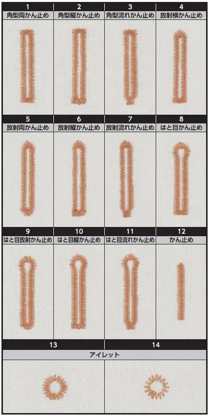 全14パターンを内蔵しています。ボタンホール(角型3種、放射型4種、はと目4種)に加え、アイレット(2種)とかん止めの縫製が可能です。