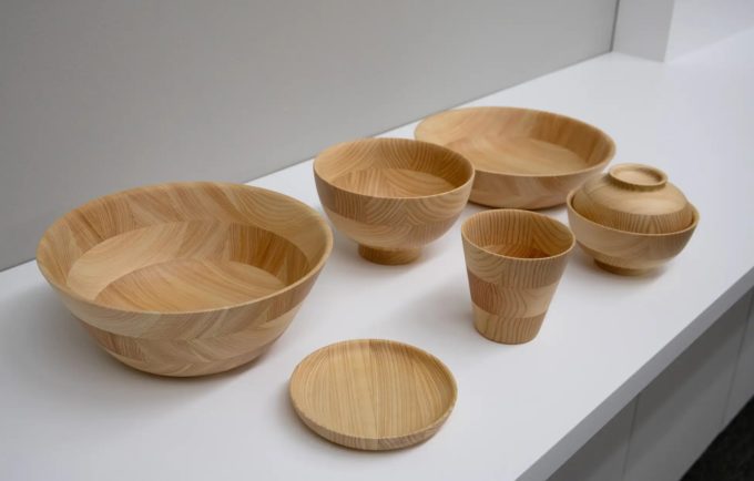 古くから伝わる「木地挽き」という技法で作られる寄せ木の食器。素材を生かすため手間をかけ、耐久性にも優れている。また小田原を中心とした間伐材を用いることで森を活性化させる環境保全にも取り組んでいる。