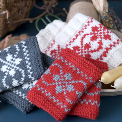 小さなノルディック柄を作って、リストウォーマーを編んでみましょう。オフホワイト、赤、グレーの3色をご用意いたしました。好きな色を2色選んで、オリジナル作品を編んでみましょう。