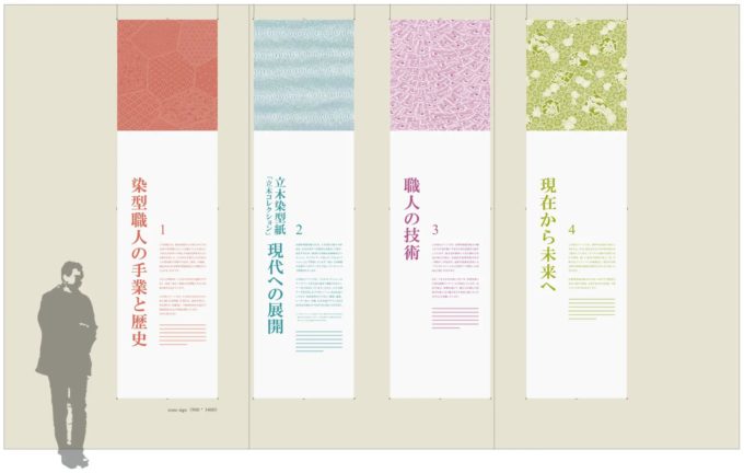 展示デザインは、本展覧会開催のきっかけとなった「立木茂コレクション」を導入展示とし、立木茂コレクションの「データアーカイブを利活用した現代の職人とのコラボ作品」、京都染型協同組合の「 職人の技術紹介と体験」、「未来に向かって進化を続ける現代の仕事」という4つのテーマで構成しています。