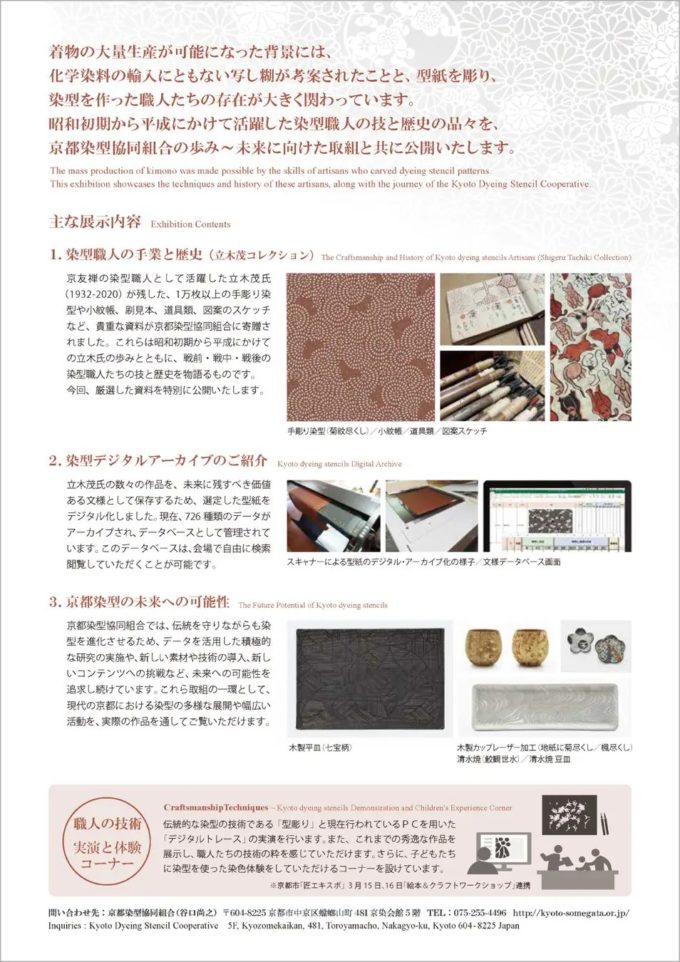 さらに職人の仕事の実演や体験を通して、京都染型協同組合の卓越した技術や伝統工芸の魅力、現代の京染型が持つ多様な展開と活動の広がりを身近に感じていただける機会を提供いたします。ぜひご覧ください。