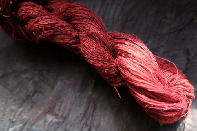 「紙布織 山内」では、この石州和紙を用いて染織作品を製作しています。この工房では、石州和紙をカッターで細く切ったものを霧吹きで湿らせたのち、ブロックの上でもみ、糸車で撚ることで紙の糸にするという、全国的にもめずらしい伝統技法を用いています。