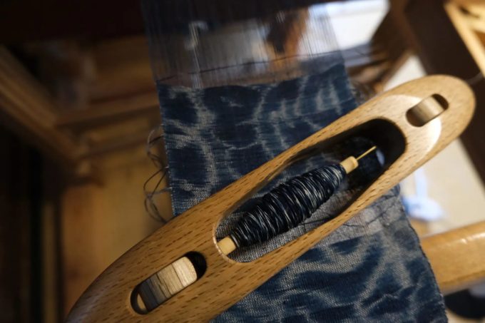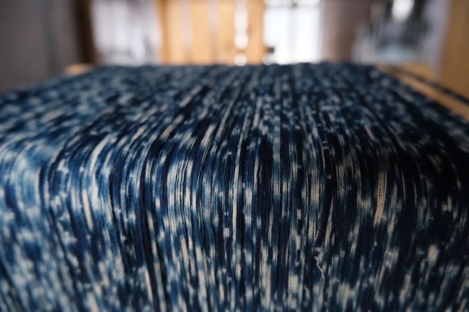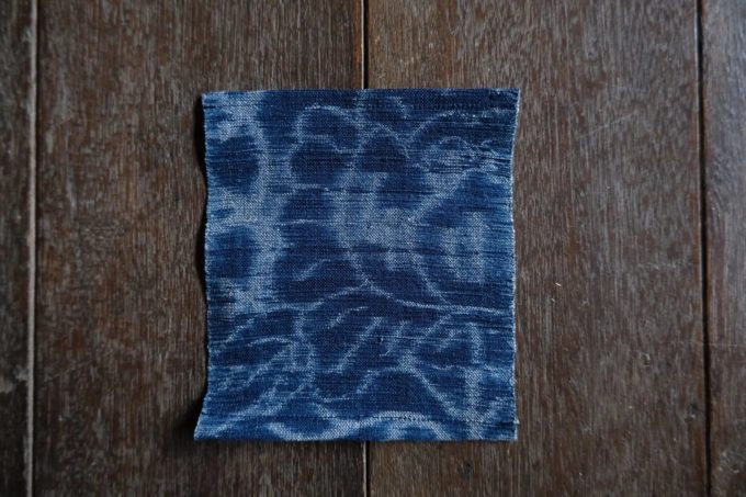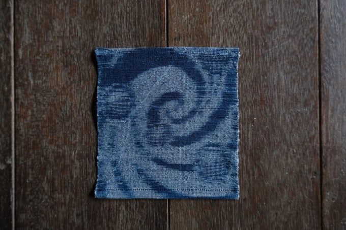 このコースターは100%紙糸を用いているため、軽量でありながらも、つるっとした手触りを楽しめます。また、紙糸は藍染めされているため、美しい色合いや独特の質感、そして伝統的な日本の文化を感じることができます。さらに、コースターの模様は絣織という特殊な手法で織られています。この手法では、柄にする部分の糸をビニールテープでくくった後、藍で染めあげます。その後、ビニールテープをほどいて織っていくことで、藍で染まらなかった部分が白い模様として浮かび上がります。その結果、柄の輪郭がわずかにずれてにじんだように見え、あらかじめ織った布に染色を施す手法では再現できない、手仕事ならではの独特な風合いを生み出すことができます