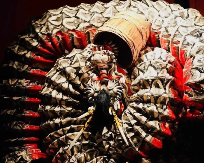 石見神楽の見どころのひとつとして、舞手が高速で回転する動作がありますが、その動きと衣装に散りばめられた渦模様によって、鑑賞者まで演目の一部として巻き込まれていくような感覚にしてくれます。