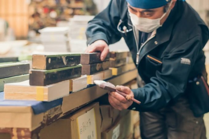 まずは弊社の木こりチームが伊那谷の山のアカマツを収穫し、その丸太を職人が四角く製材し、1枚1枚の経木に削ります。その経木をバックオフィスチームが整え、干し、乾燥したら取り込んで重しをして経木が出来上がります。ここまでが私たちの仕事。