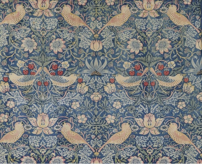 ウィリアム・モリスが初期に手掛けた壁紙をはじめモリス商会の代表的なテキスタイル、家具のほか、晩年に情熱を注いだ書籍デザインなどが登場。