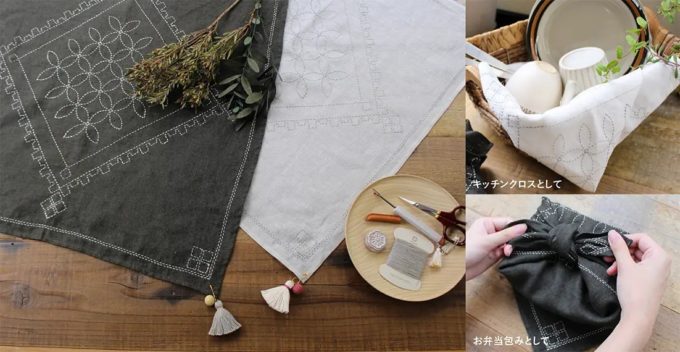 *セット内容:リネンクロス約50x50cm/刺し子糸/刺し子針/手まり付きタッセル/作り方レシピ
