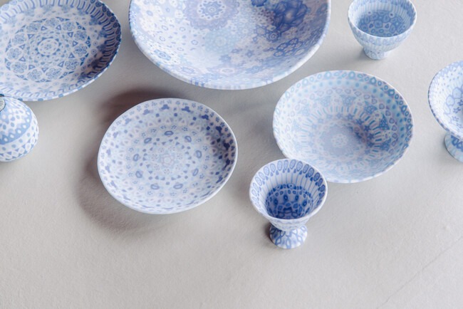 金田氏の作品は、遠目には繊細に絵付けされたもののように見えますが、色をつけた磁土を並べてパターンを作る「練り込み」という手法が用いられています。偶然性を帯びた、コラージュのような作品です。
