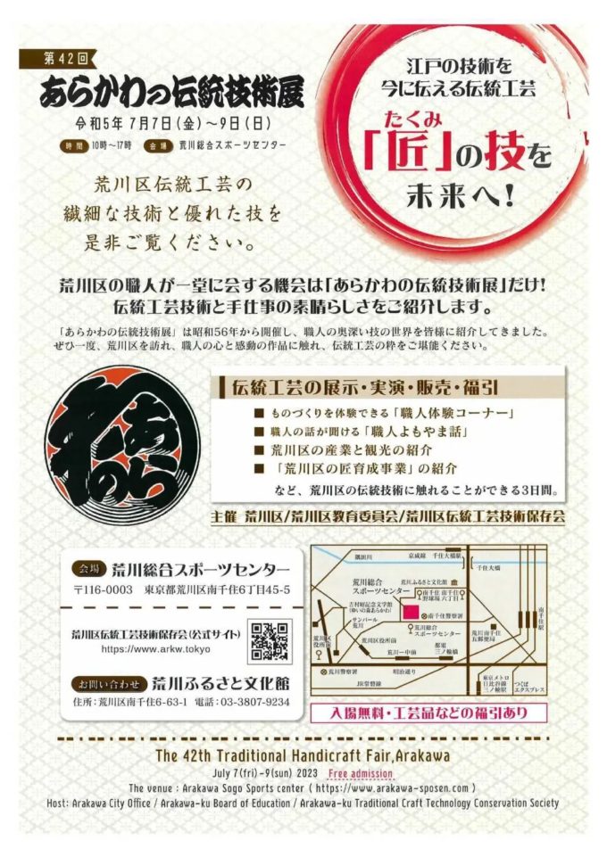 7月7日(金曜)から9日(日曜)の3日間、荒川総合スポーツセンターで「あらかわの伝統技術展」を開催します。