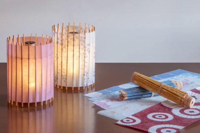 京和傘の構造を活かした卓上照明「古都里」の制作体験です。所要時間は約90分。完成品(置き型ライト付)はお持ち帰りいただけます。