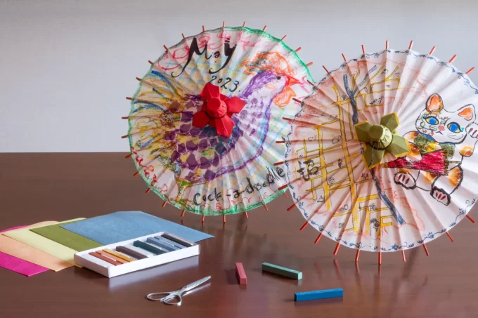 ミニ和傘(完成品)に絵付けや貼り絵を行う、小さいお子様から大人までお楽しみいただける制作体験です。所要時間は約60分。完成品はお持ち帰りいただけます。