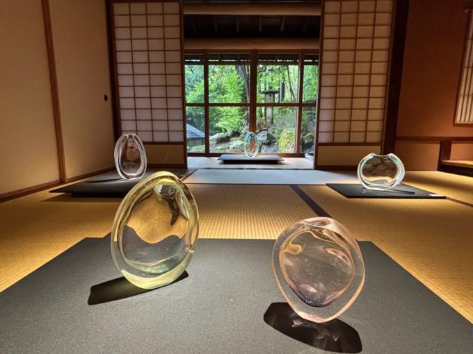 現在は、金沢市を拠点に活動するガラス作家・鹿田 洋介氏による個展『なみのあや』(会期:2025年6月4日[水]~7月1日[火])を開催中です。オブジェや花器、酒器、蓋物、器類など、約50点の透明感あふれる作品が、初夏の園内に涼やかな彩を添えています。