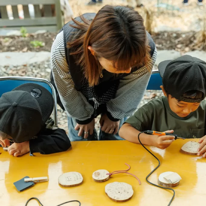 電熱ペンを使って木に絵を描いたり、ペンダントやマグネットにアレンジしたり、小さなお子様も楽しめるワークショップです。