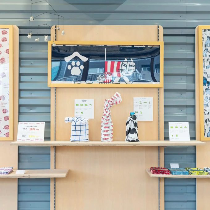 店内のピックアップコーナーにて額装されたてぬぐいや、さまざまな包み方を展示します。