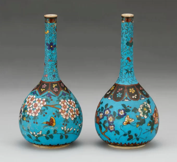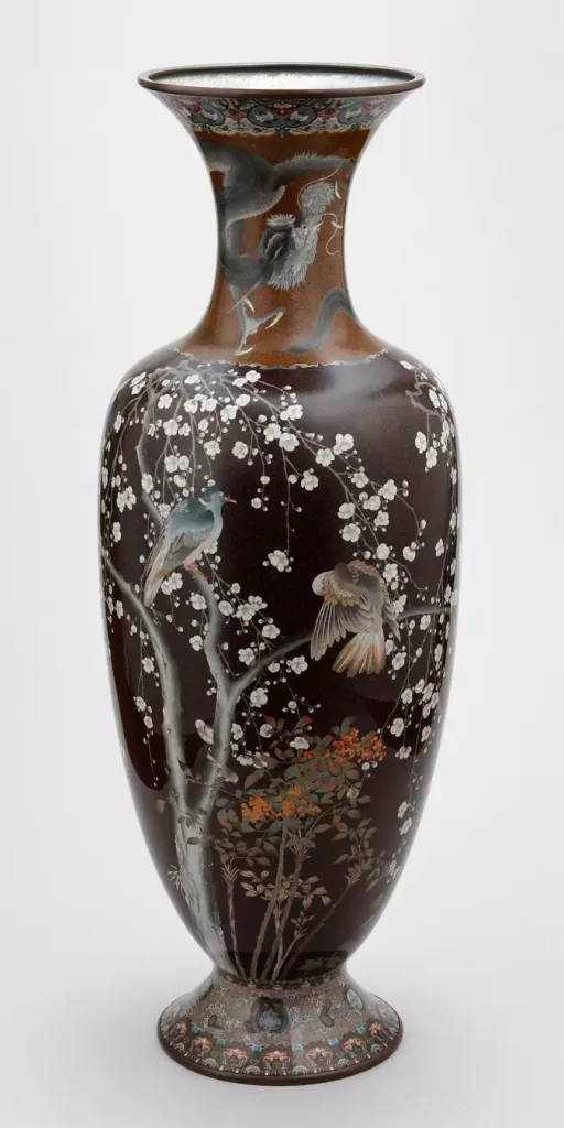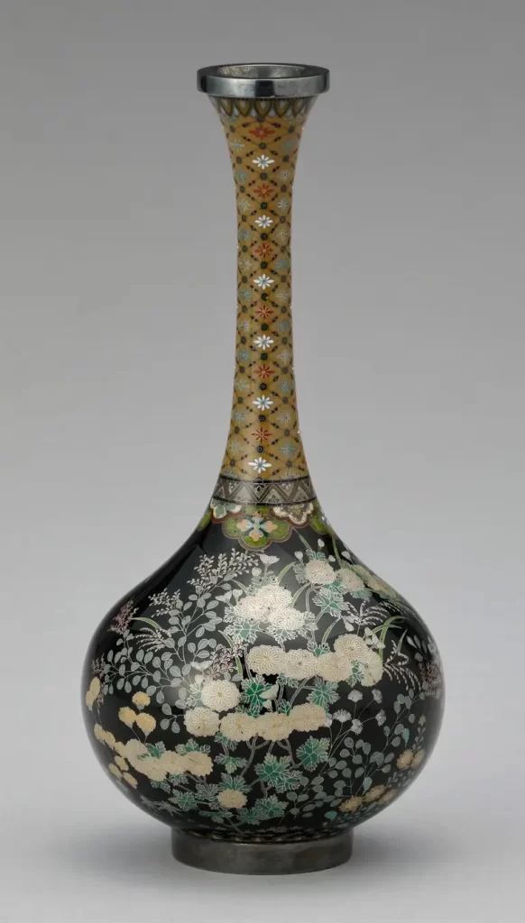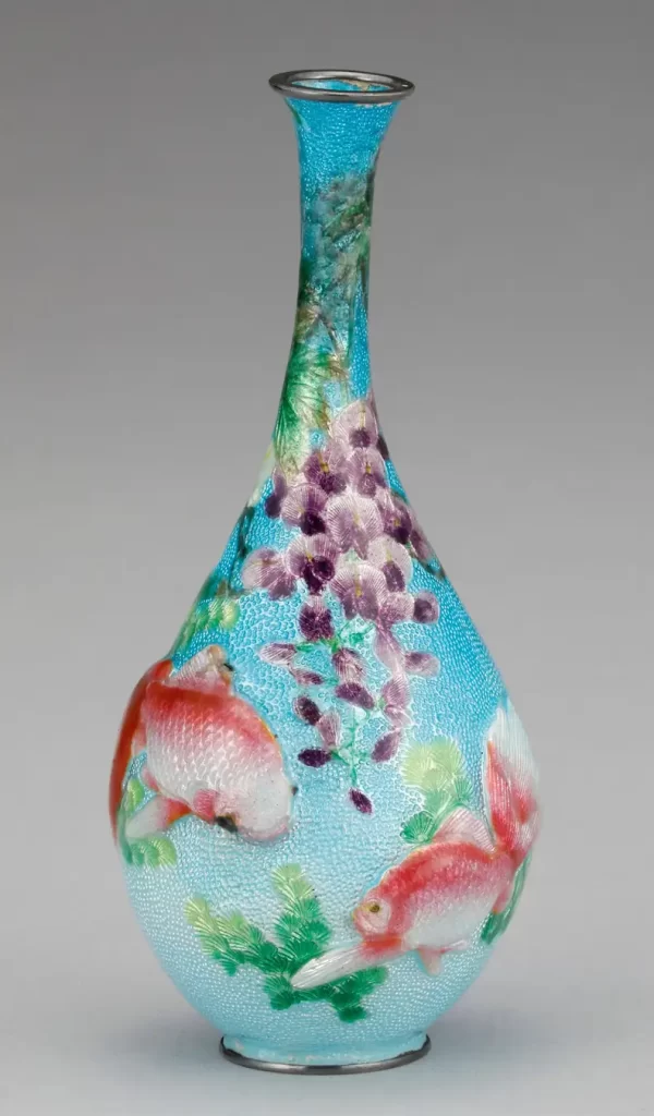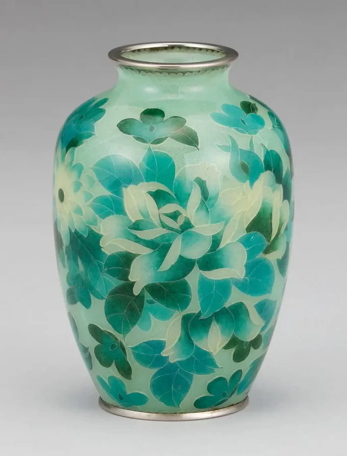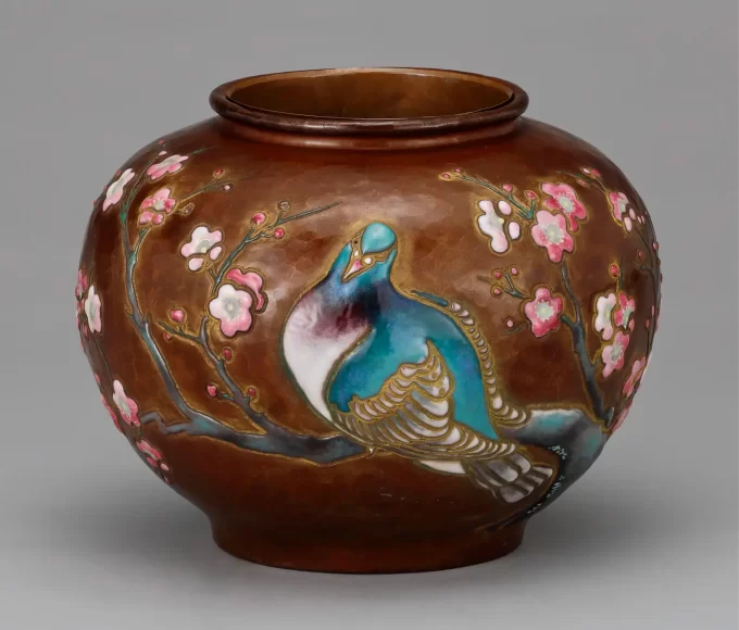 七宝は、銅や銀といった金属などの素地に釉薬を融着させて制作し、鮮やかな色彩が七つの宝石に例えられる美しいやきもので、七宝焼とも称されます。紀元前のエジプトで始まったといわれ、日本へは古墳時代末期に伝わりました。江戸時代後期に尾張藩士の梶常吉が創出した尾張七宝は、明治時代以降の重要な輸出品として、湧き上がるような技術革新を引き起こします。それは従来の七宝が、くぼめた穴の部分に釉薬を施す「象嵌」であったのに対し、銀や金などの細い帯状の金属線を貼り付けた中に釉薬を盛り込む「有線七宝」や、その植線を用いずに釉薬でグラデーションを生み出す「無線七宝」など、近代七宝の極みともいうべき職人技の発展でした。尾張七宝の技法は各地に広まって帝室技芸員を誕生させた一方で、高度な技術を有しながらも、その名が知られずにいる名工たちの活躍もあったのです。