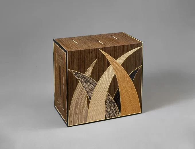 江戸指物師の家系に生まれ、伝統技法を忠実に継承し、木材の特性を巧みに活かしつつ様式美を追求する島崎氏。釘を使わずに木材を精緻に組み上げる組手技法は、強度と耐久性を高め、漆仕上げによる木目の美しさは一点ごとに異なる表情を見せます。技巧を誇示することなく、堅牢さと繊細さを併せ持つその作品には江戸の粋が凝縮されています。