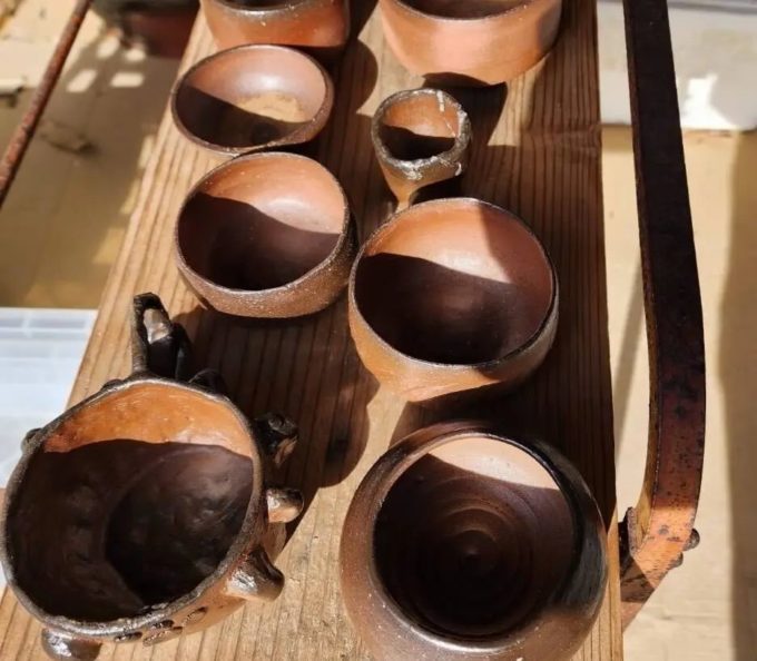 焼き物の多くは、「釉薬(ゆうやく)」と呼ばれるガラス質のような表面になる薬品をかけて完成させます。しかし、備前焼は釉薬を使わず、また絵付けもせずに備前の田土(ヒヨセ)と呼ばれる、田んぼの底土から採取する粘土質の土のみで約1200度~1300度の窯で2週間かけて焼き上げます。土のみで焼き上げた備前焼は丈夫で保温性が高く、表面の微細な凸凹により、通気性やまろやかさを生み出す特質があることから、お食事やお酒の器として最適です。