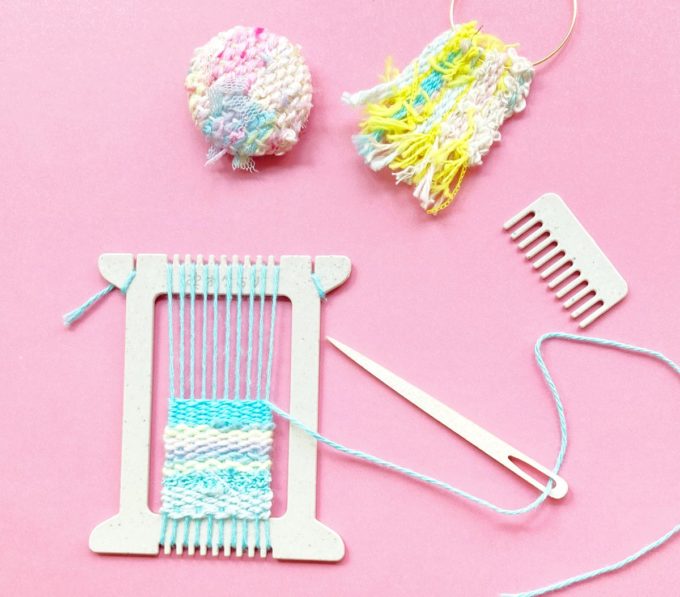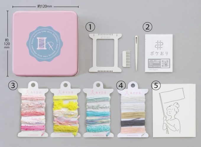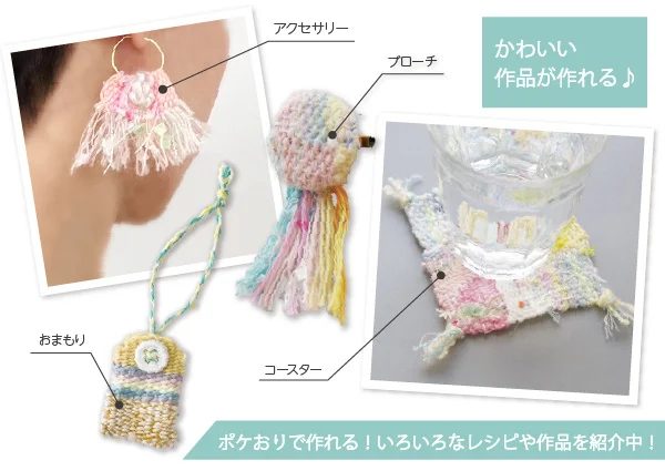 ポケットサイズのミニ織り機「ポケおり」と、限定パステルカラーの「あそび糸」がセットになり、保管に便利なかわいい缶に入って登場!すぐに始められ、初めての方でも簡単に小さな手織りの作品を作ることができます。織ったものは雑貨や、アクセサリー、ファッションのアクセントにしたりと、工夫次第で楽しさが広がります。