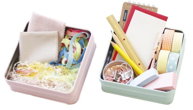 缶の中に、ポケおりやあそび糸、はさみなどを入れて、いつでもどこでも気軽にポケおりを楽しめます。他にも、織った作品や糸を入れたり、裁縫道具や文房具入れにするなど、コンパクトで使いやすい正方形の缶なのでさまざまな使い方ができます。