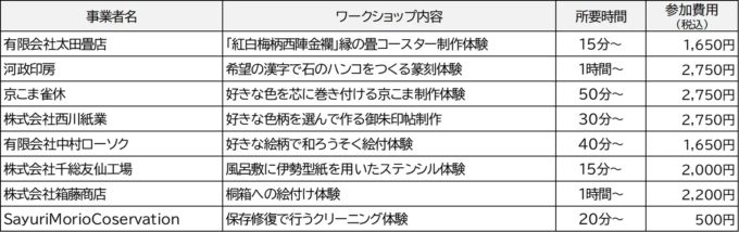 このイベントは、伝統産業・文化に触れる機会の創出を通して京都の伝統産業振興と定住促進を図ることを目的としており、京都の伝統産業等を体験できる8つのワークショップと、工芸品や食品の販売などを予定しています。