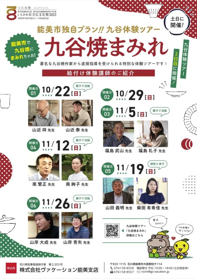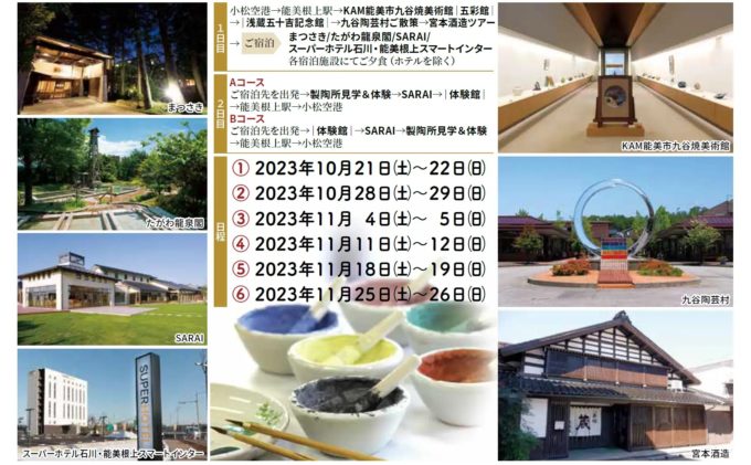 九谷体験ツアー「九谷焼まみれ」では、『土・日宿泊無しコース』と『日曜日のみ日帰りコース』を追加してご案内しています!