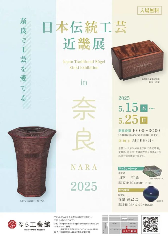 長い歴史の中で研ぎ澄まされてきた奈良工芸の振興発展を図ることを目的として設置された『なら工藝館』にて、企画展「日本伝統工芸近畿展 in NARA 2025」を開催いたします。今回、「第54回日本伝統工芸近畿展」出品作品の中から受賞者、奈良市または近隣に在住入選者などの30数点を展示する予定です。