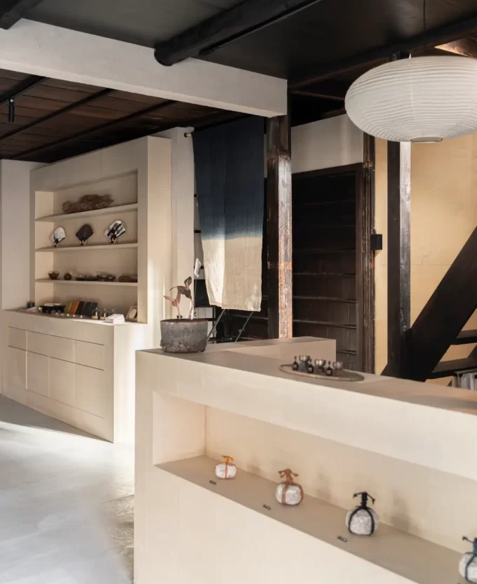 新店舗の空間では、日本の職人技が随所に息づいています。和紙作家・ハタノワタルによる和紙家具や仕上げ、畳職人・横山充の丁寧な手仕事、さらに入口の提灯や暖簾、国産木材を用いた什器など、すべてがPOJ Studioとゆかりのある職人たちの技と感性によって形づくられています。