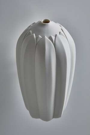 若杉聖子は1977年富山県出身。現在は兵庫県三田市にアトリエを構え作陶・発表するとともに、京都市立芸術大学で後進の指導にも尽力しています。鋳型に流し込む鋳込み技法を用いた白磁の作品は、石膏の原型を丁寧に削り出し作られる繊細で柔らかな造形で国内外問わず多くの人を魅了しています。外側を無釉で焼き上げることで白磁の肌の質感を生かし、光の陰影をシャープに捉えることで、洗練された造形美を際立たせ凛とした佇まいを見せます。