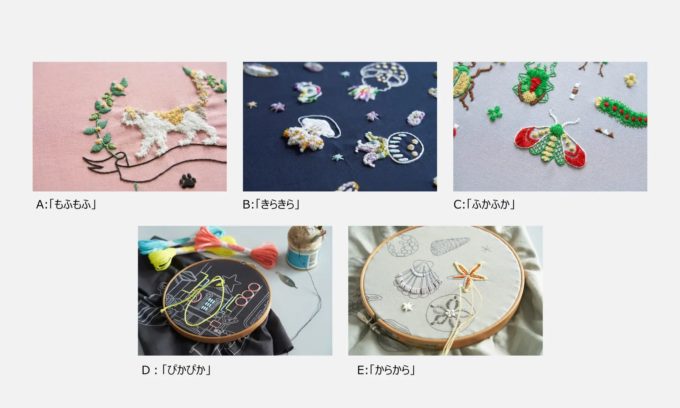 糸の種類は “オノマトペ”で表現され、新商品を加えた「もふもふ」「きらきら」「ふかふか」「ぴかぴか」「からから」5種のキットに含まれるサンプラーを使用し、基本のステッチの練習をしながら、ototoitoの特徴や、より質感を保ちながら綺麗に仕上げる方法をatsumiさんご本人より教えていただきます。