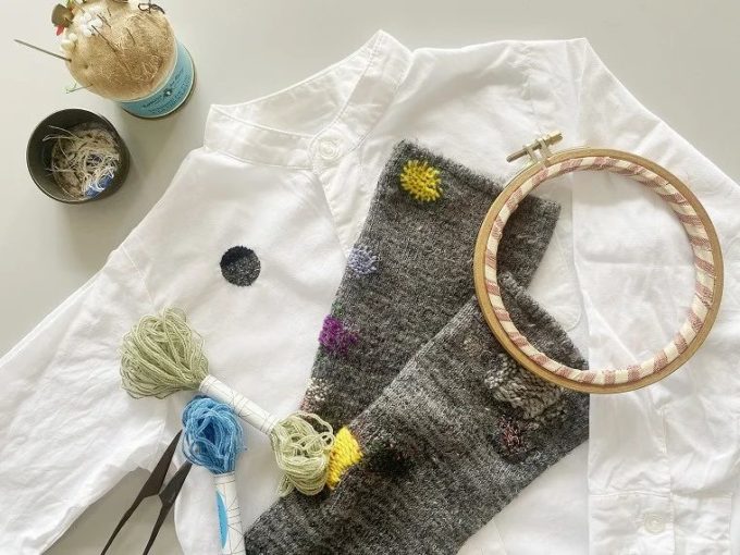 ・持ち物:繕いたいもの(シャツやニットなど)、刺繍枠(5〜12cm 穴の大きさに合うサイズ)、刺繍針(2〜4本どり用)、糸切りばさみ、ピンクッション、チャコペン、お持ちの方はダーニングマッシュルーム