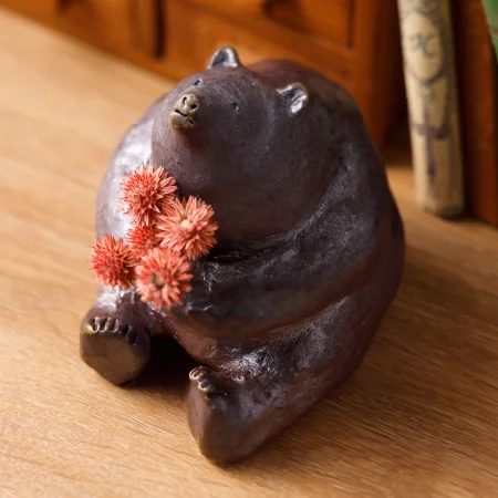 熊の美しい瞳が忘れられず。薪窯で5日間かけて焼き締めた、土の色と自然釉のコントラストが魅力の陶器の熊。
