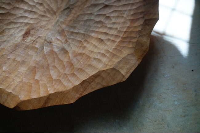 一刀一刀の痕跡が残る形状、テクスチャーは、木そのものが導く形でもあり、作家が素材と対峙し、格闘した痕跡でもある。