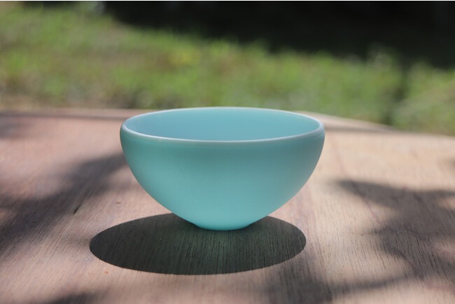 光を透過する軽やかなブルーの器は、石垣島の自然を彷彿とさせながらも、「やちむん」のイメージを大きく変えてしまう印象的な作品。