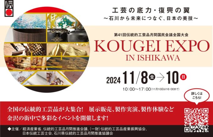 一般財団法人 伝統的工芸品産業振興協会は、日本全国の伝統的工芸品が一堂に会す「KOUGEI EXPO IN ISHIKAWA(第41回伝統的工芸品月間国民会議全国大会)」を、2024年11月8日(金)~10日(日)「石川県政記念しいのき迎賓館」「金沢21世紀美術館」等をメイン会場として開催いたします。