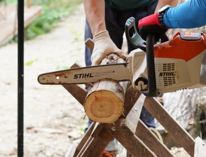 大きな丸太をノコギリを使って輪切りにカットする、丸太切りワークショップに参加して