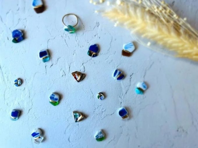 欠けてしまった有田焼の陶片や、海に揺られ揺られて浜辺に流れ着いたシー陶器、シーグラスに天然石などを組合わせ、「金継ぎ」の技法を生かした素敵なアクセサリーを作ります。