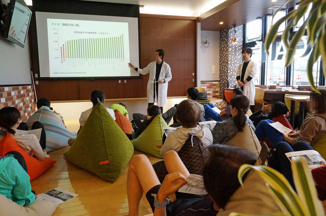 毎日を健康に過ごすためには、運動や食事も大切ですが、睡眠も重要です。日々の忙しさやストレスが要因となり、眠れない人が増えています。睡眠ワークショップでは、睡眠の基礎知識のレクチャーやクイズを交え、楽しみながら睡眠を学ぶことができます。