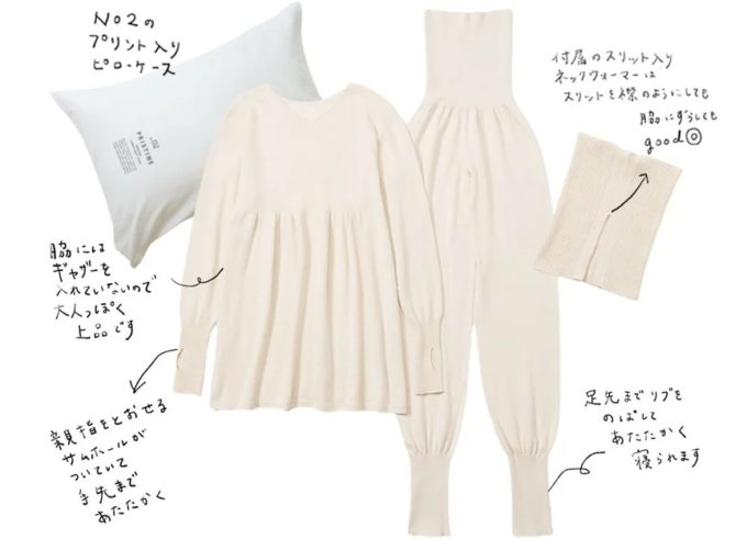Vネックのギャザープルオーバーにネックウォーマーを合わせ、足先もすっぽり覆えるパンツとセットにしました。枕カバーとしてお使いいただけるオーガニックコットンの袋入りです