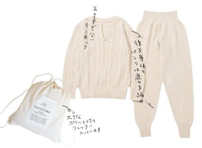 ケーブル編みと鹿の子編みを組み合わせたキーネックのセーターに、鹿の子編みのニットパンツを合わせ、このセット限定のナップサックに入れました。