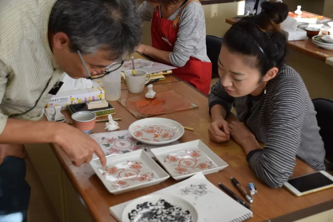 上絵付体験の様子。現役研修生がコツを伝授!