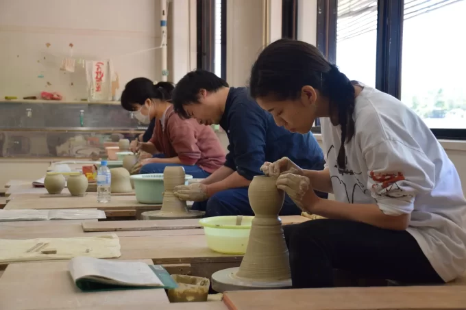 ろくろ成形、手びねり、絵付け、焼成などの陶芸技術に加え、デザインやマーケティングの知識も幅広く学べる環境を整えています。開所以来750名以上の卒業生を輩出し、多くが産地で活躍しています。