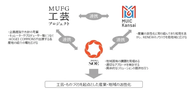 また、MUICは、MUFGと連携し企画立案・運営をサポートするとともに、「産業観光」を切り口とした地域活性化や全国の工芸産地を繋ぎ・強くする橋渡しの役割を果たしていきます。課題起点で大企業やスタートアップの集積や協業を生み出し、地域のアセット(食、産品、文化等の観光資源など)を活用して産業の活性化に取り組んできた知見を活かし、RENEWのノウハウを他地域に広げる役割を担います。