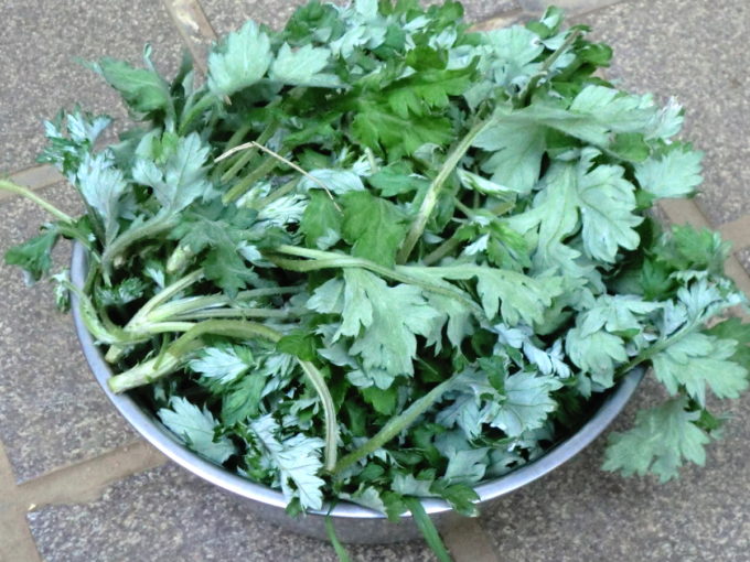 - 鍋で植物を煮て染液を作る