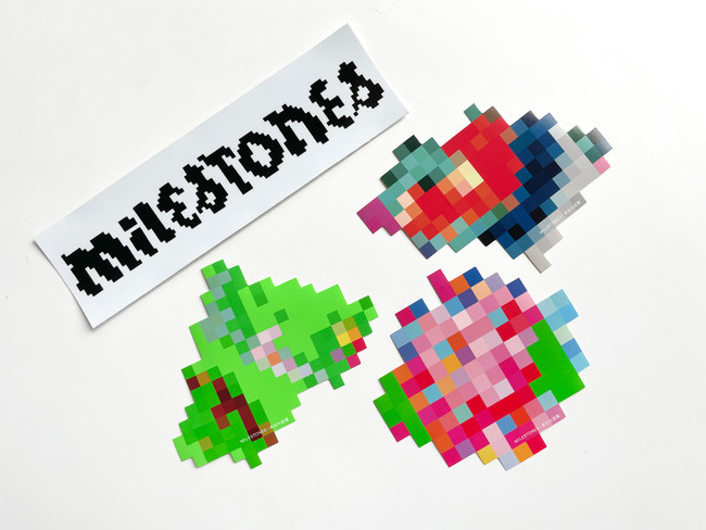 「MILESTONESー余白の図案」にご来場いただいた方に、オリジナルステッカー4種の中からどれか1点をプレゼントしています。(色柄は選べません。)