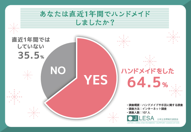 そこで今回、日本生活環境支援協会(https://www.nihonsupport.org/ )は、全国の20代から60代以上の男女を対象に、「直近1年間と今後のハンドメイド」に関する調査を実施しました。