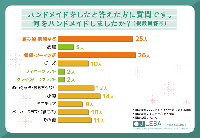 『編み物・刺繍』などが38人と最も多く、次いで『裁縫・ソーイング』が24人、『ビーズ』や『ぬいぐるみ・おもちゃ』がそれぞれ21人、『衣服』や『小物』がそれぞれ19人、『ミニチュア』が14人、『ペーパークラフト』が13人、『ワイヤークラフト』が10人、『クレイクラフト』が9人、『その他』が8人という結果となりました。