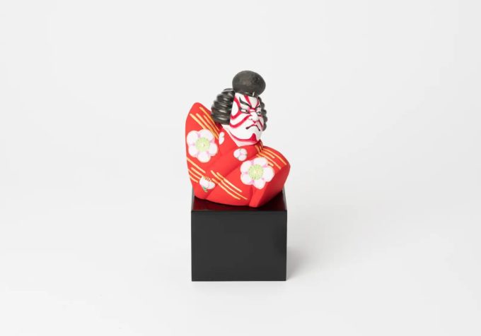 『菅原伝授手習鑑』の「車引」の場の主要な登場人物である三つ子の一人、牛飼い舎人(とねり)として菅丞相に仕える梅王丸をモデルにしながら、隈取の代表格の筋隈をク ローズアップしたオリジナル博多人形(胸像)です。「車引」は三つ子の舎人の争いを描く様式美溢れる荒事の名場面と言われています。