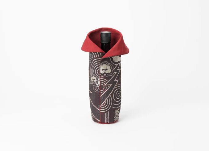 菅丞相が雷神と化したことを視覚的・象徴的に示すよう、歌舞伎の衣裳に表現された雲と雷の図案を参考にしながら、鎌倉時代から受け継がれる博多織献上柄のデザインと掛け合わせ再構築したオリジナル献上柄です。本事業では、上記で開発した博多織のオリジナル献上柄を使用したボトルカバーを制作しています。